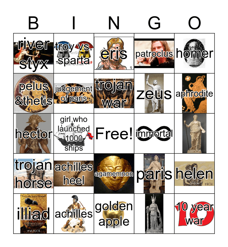 This bingo card has 24 images, a free space and 22 words: achilles heel, achilles, trojan war, illiad, homer, river styx, pelus &thetis, troy vs. sparta, immortal, agamemnon, zeus, hector, paris, helen, judgement of paris, eris, aphrodite, girl who launched 1000 ships, 10 year war, trojan horse, patroclus and golden apple.