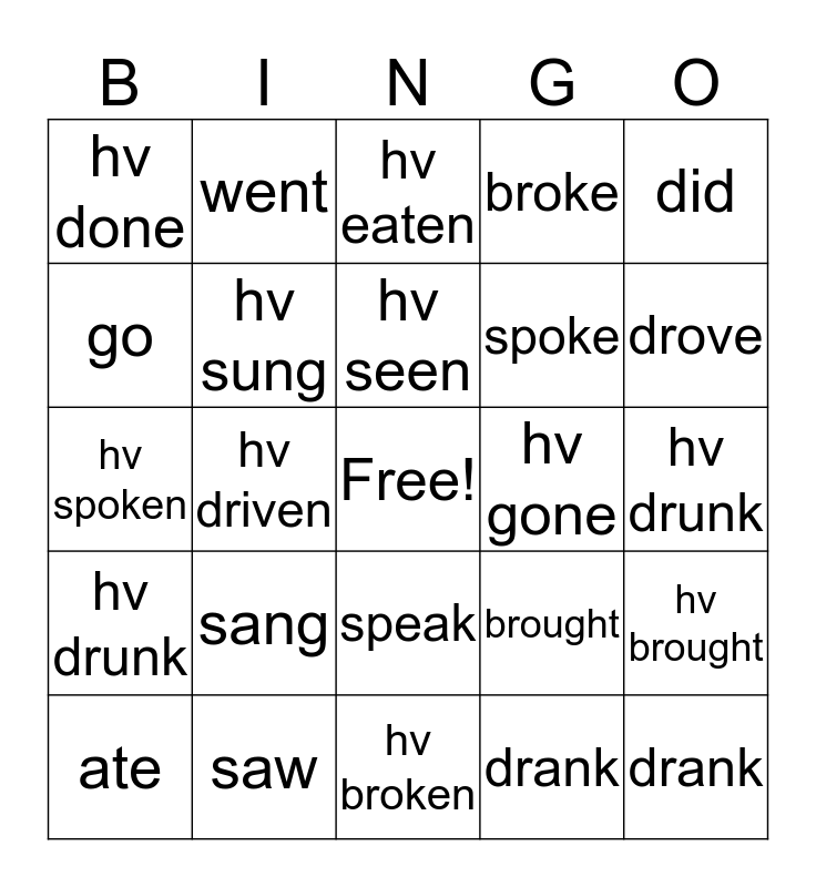 This bingo card has a free space and 24 words: sang, saw, hv seen, ate, did, hv done, go, went, hv gone, speak, spoke, hv spoken, brought, hv brought, hv sung, drank, hv drunk, hv eaten, drove, hv driven, drank, hv drunk, broke and hv broken.