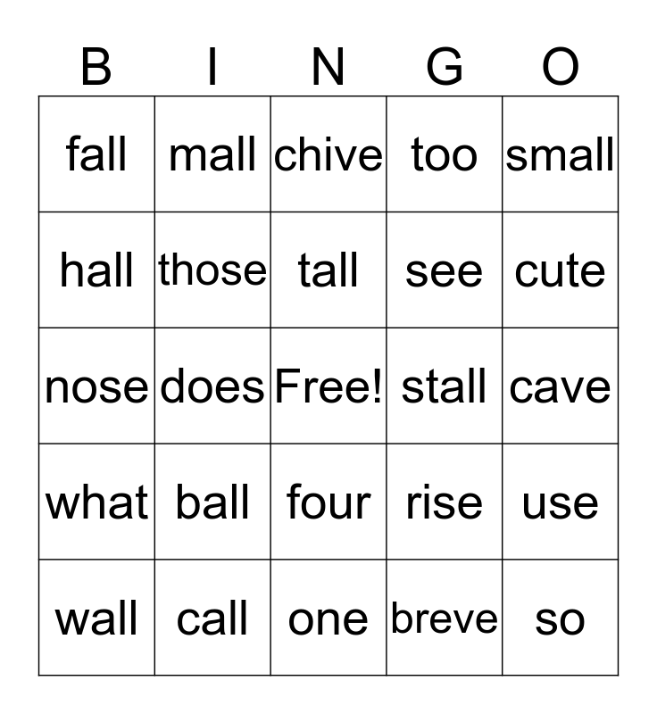 This bingo card has a free space and 24 words: ball, call, tall, wall, small, fall, hall, mall, stall, four, see, nose, rise, use, those, breve, cave, chive, cute, does, so, what, too and one.