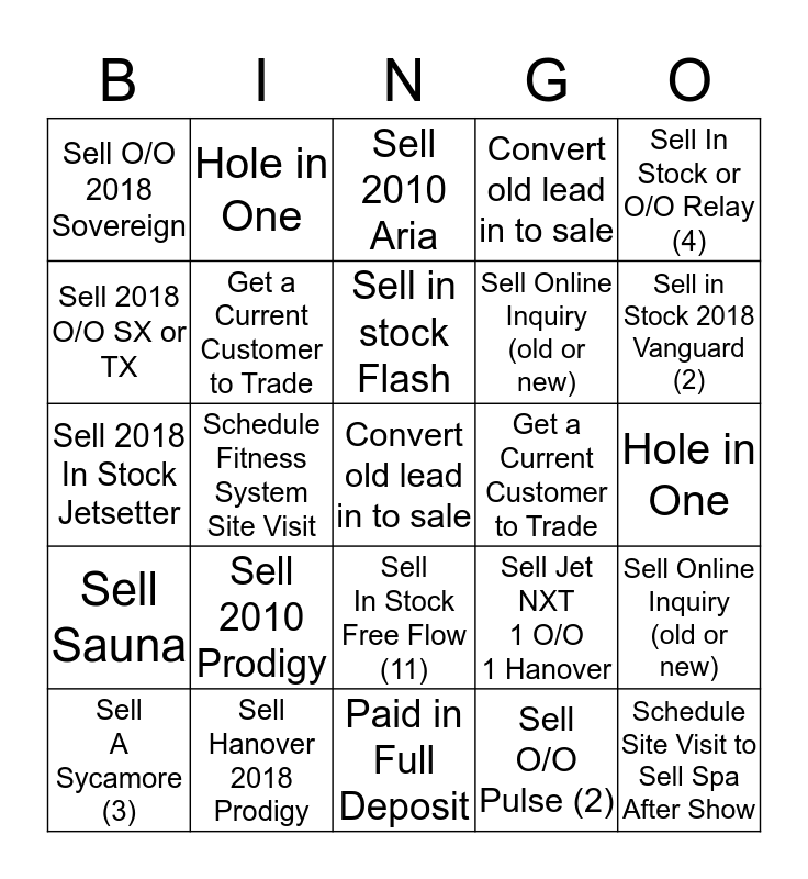This bingo card has a free space and 29 words: Sell A Sycamore (3), Sell '02 Bengal, Schedule Fitness System Site Visit, Sell 2013 Bolt, Sell O/O 2018 Sovereign, Sell 2010 Aria, Get a Current Customer to Trade, Sell 2010 Prodigy, Get a Current Customer to Trade, Sell Hanover 2018 Prodigy, Hole in One, Schedule Site Visit to Sell Spa After Show, Paid in Full Deposit, Sell O/O Pulse (2), Sell in Stock 2018 Vanguard (2), Sell 2017 Grandee, Sell In Stock Free Flow (11), Sell Sauna, Sell In Stock or O/O Relay (4), Sell 2018 In Stock Jetsetter, Sell Jet NXT 1 O/O 1 Hanover, Sell O/O Rhythm (1), Sell Online Inquiry (old or new), Sell 2018 O/O SX or TX, Convert old lead in to sale, Hole in One, Sell Online Inquiry (old or new), Sell in stock Flash and Sell In Stock Flair.