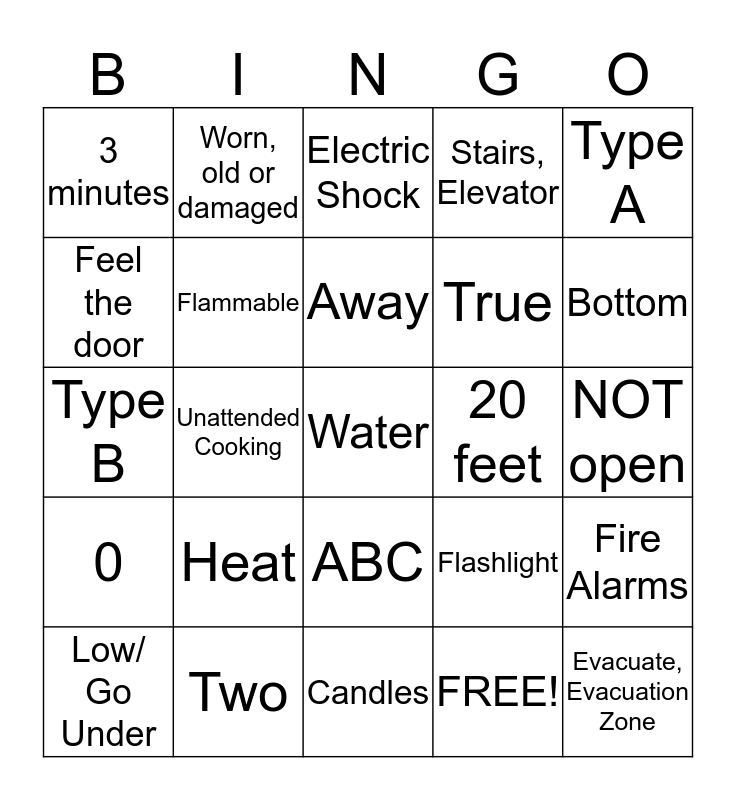 This bingo card has 30 words: Two, Window, Unattended Cooking, Don't open, unplug, 3 minutes, Electric Shock, Flammable, ABC, 20 feet, Candles, NOT open, Water, FREE!, Evacuate, Evacuation Zone, Bottom, False, Flashlight, 0, Heat, Type A, Type B, Type C, Worn, old or damaged, True, Feel the door, Stairs, Elevator, Fire Alarms, Low/ Go Under, Away and Close.