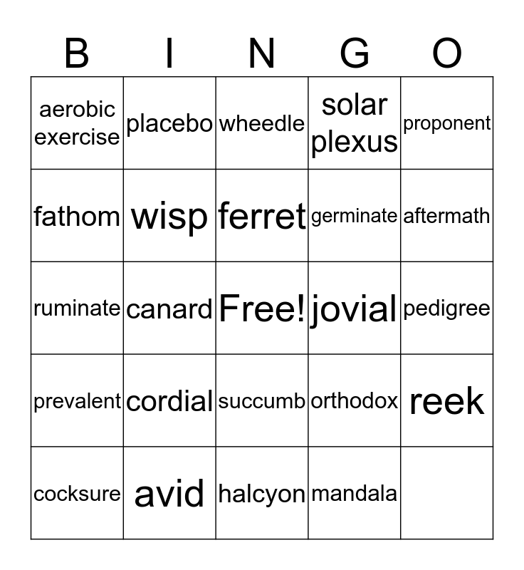 This bingo card has a free space and 24 words: prevalent, avid, succumb, orthodox, proponent, aerobic exercise, placebo, wheedle, germinate, reek, fathom, wisp, oval, jovial, aftermath, cocksure, canard, ferret, solar plexus, pedigree, ruminate, cordial, halcyon and mandala.