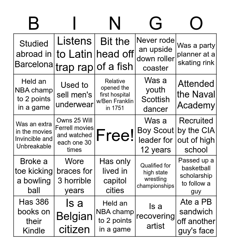 This bingo card has a free space and 24 words: Wore braces for 3 horrible years, Is a Belgian citizen, Relative opened the first hospital w/Ben Franklin in 1751, Has 386 books on their Kindle, Was a party planner at a skating rink, Studied abroad in Barcelona, Held an NBA champ to 2 points in a game, Listens to Latin trap rap, Was a Boy Scout leader for 12 years, Has only lived in capitol cities, Was a youth Scottish dancer, Was an extra in the movies Invincible and Unbreakable, Qualified for high state wrestling championships, Passed up a basketball scholarship to follow a guy, Used to sell men's underwear, Is a recovering artist, Recruited by the CIA out of high school, Bit the head off of a fish, Attended the Naval Academy, Owns 25 Will Ferrell movies and watched each one 30 times, Ate a PB sandwich off another guy's face, Broke a toe kicking a bowling ball, Never rode an upside down roller coaster and Held an NBA champ to 2 points in a game.