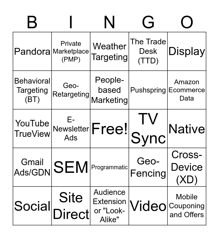 This bingo card has a free space and 24 words: Social, SEM, People-based Marketing, Video, Display, Pandora, Private Marketplace (PMP), Weather Targeting, TV Sync, Native, YouTube TrueView, Geo-Retargeting, Geo-Fencing, Cross-Device (XD), Behavioral Targeting (BT), Site Direct, Audience Extension or "Look-Alike", The Trade Desk (TTD), Amazon Ecommerce Data, Gmail Ads/GDN, E-Newsletter Ads, Programmatic, Pushspring and Mobile Couponing and Offers.