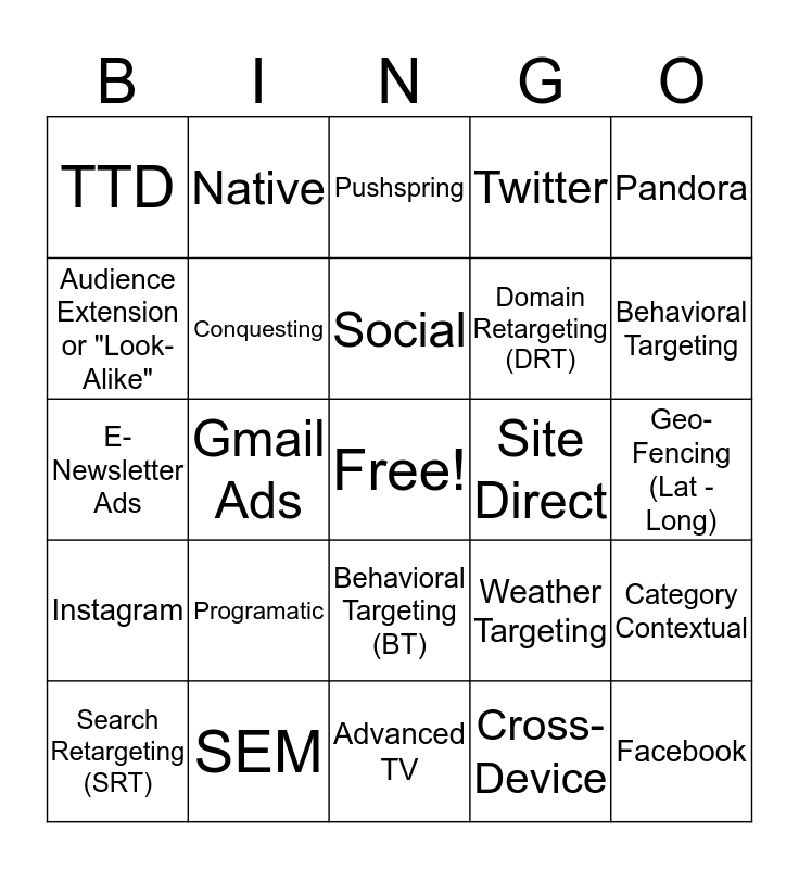 This bingo card has a free space and 24 words: Programatic, SEM, Social, Search Retargeting (SRT), Pandora, TTD, Audience Extension or "Look-Alike", Native, Site Direct, Behavioral Targeting (BT), Domain Retargeting (DRT), E-Newsletter Ads, Weather Targeting, Category Contextual, Conquesting, Cross-Device, Geo-Fencing (Lat - Long), Pushspring, Behavioral Targeting, Gmail Ads, Facebook, Instagram, Twitter and Advanced TV.