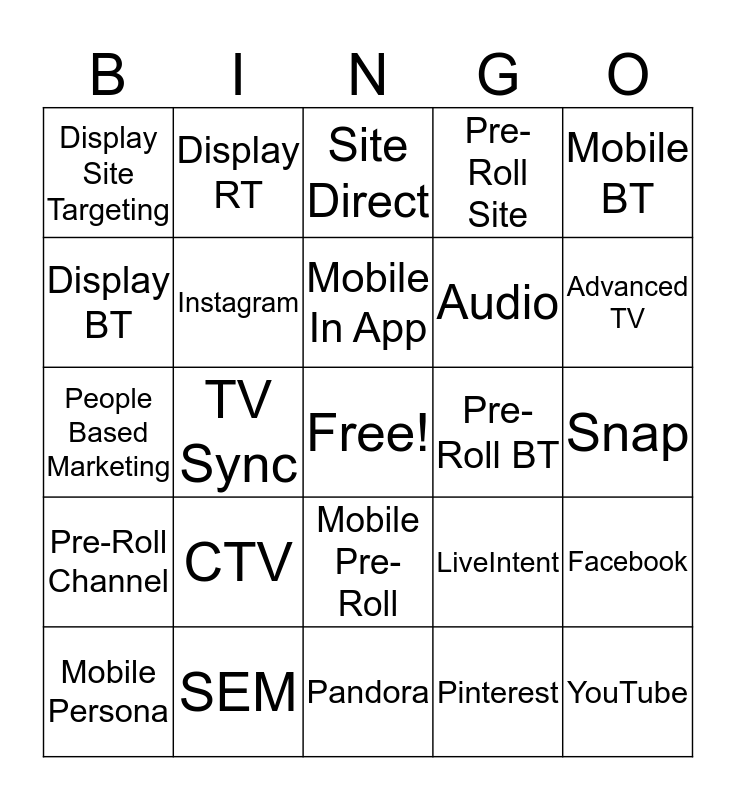This bingo card has a free space and 24 words: CTV, SEM, Mobile In App, Mobile Persona, Mobile BT, Display Site Targeting, Display BT, Display RT, Pre-Roll BT, Mobile Pre-Roll, Audio, People Based Marketing, LiveIntent, Facebook, Instagram, Pinterest, Snap, Site Direct, Advanced TV, TV Sync, YouTube, Pre-Roll Channel, Pre-Roll Site and Pandora.