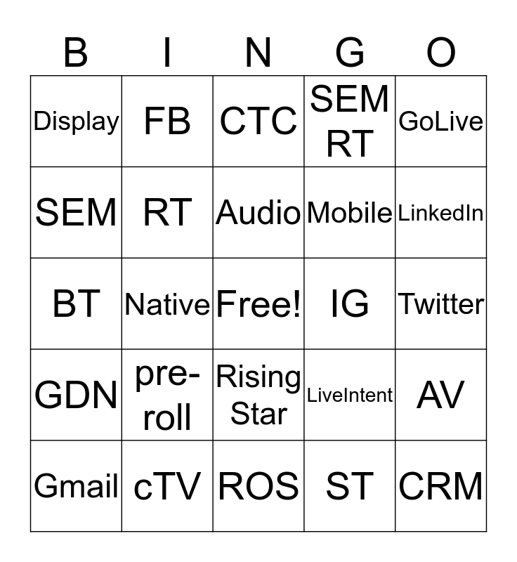 This bingo card has a free space and 24 words: pre-roll, cTV, Audio, Gmail, GoLive, Display, SEM, FB, IG, Rising Star, Mobile, BT, LiveIntent, AV, RT, ST, Twitter, CTC, LinkedIn, Native, CRM, GDN, SEM RT and ROS.