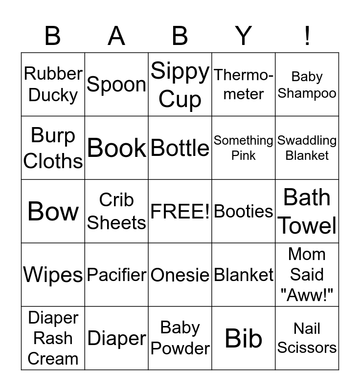 This bingo card has a free space and 24 words: Pacifier, Diaper, Bottle, Diaper Rash Cream, Baby Shampoo, Rubber Ducky, Burp Cloths, Spoon, Booties, Onesie, Something Pink, Bow, Blanket, Mom Said "Aww!", Book, Bib, Bath Towel, Sippy Cup, Swaddling Blanket, Crib Sheets, Nail Scissors, Wipes, Thermo-meter and Baby Powder.