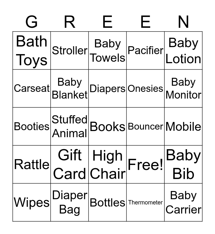 This bingo card has 25 words: Gift Card, Bottles, Diapers, Wipes, Baby Lotion, Bath Toys, Carseat, Stroller, Bouncer, High Chair, Onesies, Booties, Free!, Baby Bib, Baby Blanket, Baby Carrier, Mobile, Baby Towels, Baby Monitor, Stuffed Animal, Books, Diaper Bag, Rattle, Pacifier and Thermometer.