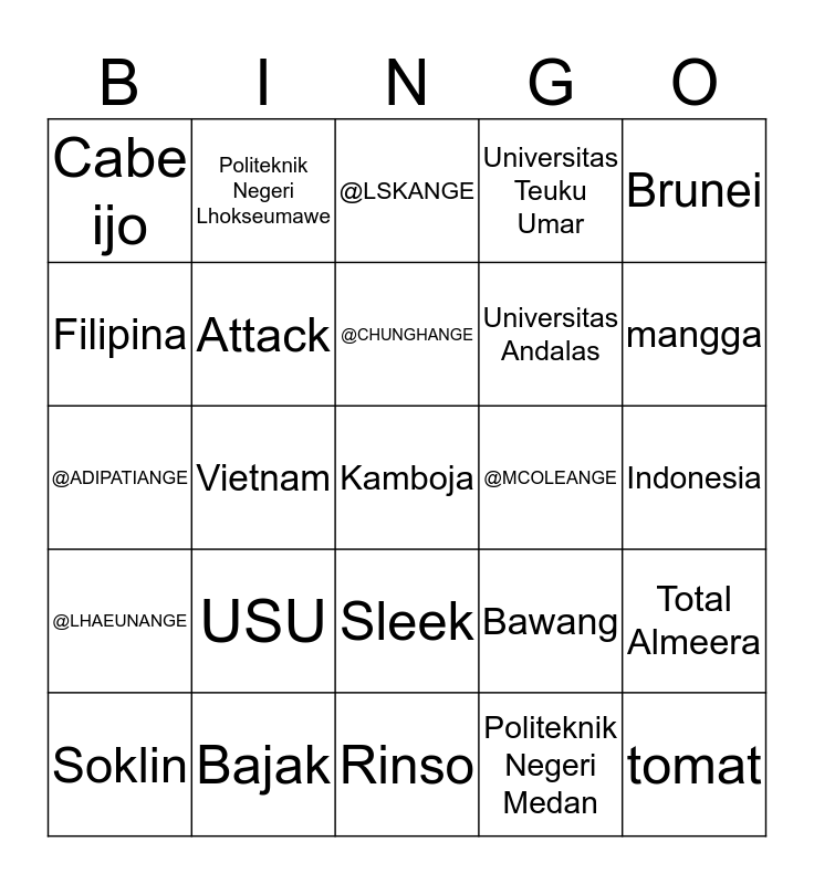 This bingo card has a free space and 24 words: USU, Bajak, @CHUNGHANGE, Soklin, Brunei, Cabe ijo, Filipina, Politeknik Negeri Lhokseumawe, @MCOLEANGE, Sleek, Universitas Andalas, @ADIPATIANGE, Bawang, Total Almeera, Attack, Politeknik Negeri Medan, Indonesia, @LSKANGE, mangga, Vietnam, tomat, @LHAEUNANGE, Universitas Teuku Umar and Rinso.