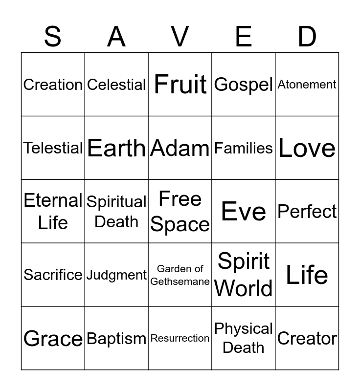 This bingo card has a free space and 50 words: Salvation, Creator, Mercy, Resurrection, Judgment, Glory, Celestial, Terrestrial, Telestial, Joy, Earth, Gospel, Life, Spirit World, Premortal Life, Garden of Eden, Adam, Eve, Jesus Christ, Atonement, Spiritual Death, Physical Death, Creation, Families, Agency, Sin, Love, Choices, Fruit, Garden of Gethsemane, Prepare, Purpose, Change, Improve, Baptism, Faith, Ordinances, Temple, Bodies, Perfect, Commandments, Doctrine, Church, The Fall, Grace, Eternal Life, Immortality, Heavenly Father, Sacrifice and Ancestors.