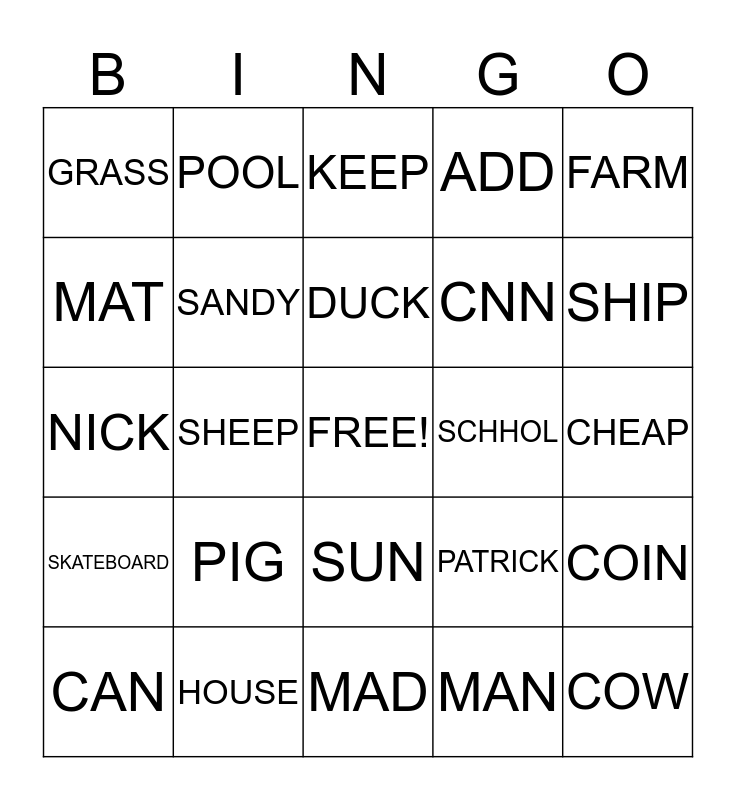 This bingo card has a free space and 24 words: PIG, HOUSE, DUCK, CAN, FARM, GRASS, MAT, POOL, SCHHOL, SUN, CNN, NICK, PATRICK, COIN, SANDY, MAN, CHEAP, KEEP, SHIP, SHEEP, COW, SKATEBOARD, ADD and MAD.