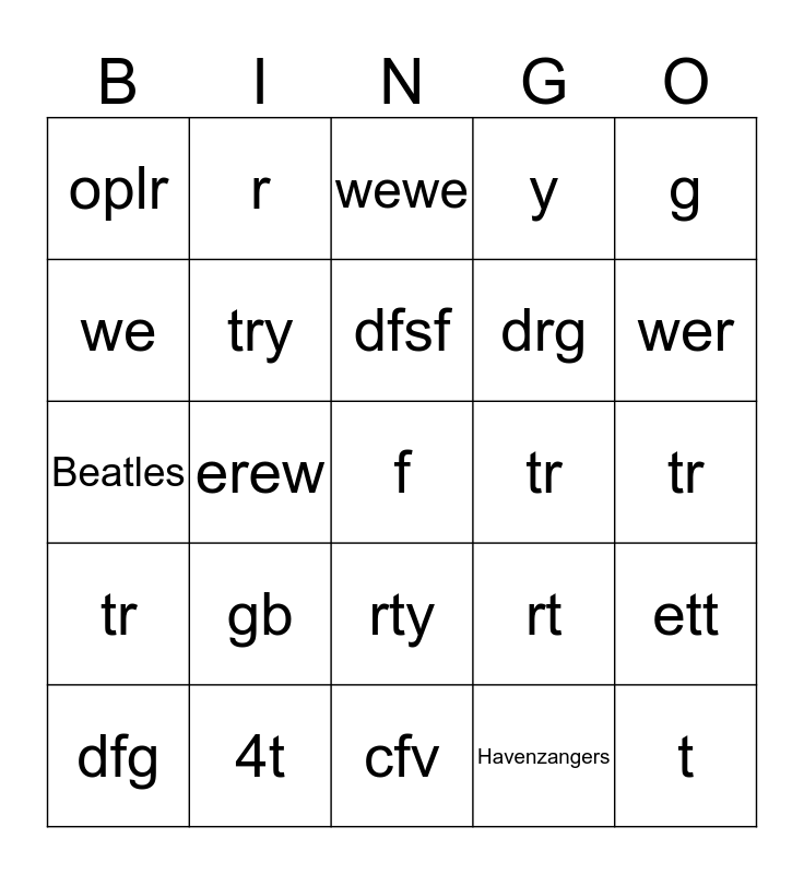 This bingo card has 68 words: Free!, Beatles, K3, Wham, Havenzangers, go, oplr, oe, dfsf, sfsdf, ett, er, erew, wewe, wer, wer, we, r, t, tr, tr, tr, gb, gb, h, h, h, gb, cfv, g, g, g, drg, trt, y, tr, ert, 4t, f, drg, t, r5y, try, ry, drg, dfg, dfg, df, rty, rt, tyy, dfgh, tg, dg, r, r, dfg, err, er, e5, er, er, e, tr, gfh, gfh, gh and gn.