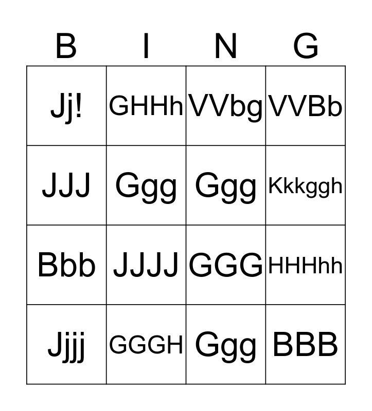 This bingo card has 16 words: Jjjj, GGGH, VVbg, VVBb, JJJ, GHHh, GGG, HHHhh, Jj!, Ggg, Ggg, Kkkggh, Bbb, JJJJ, Ggg and BBB.