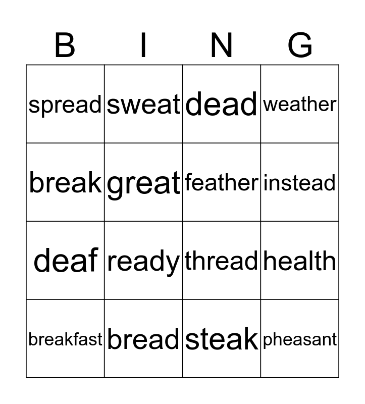 This bingo card has 16 words: bread, health, dead, spread, deaf, sweat, thread, steak, break, great, breakfast, weather, ready, instead, feather and pheasant.