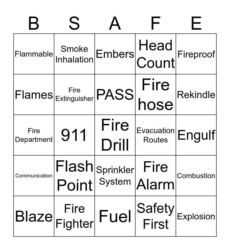This bingo card has 25 words: Flash Point, Fuel, PASS, Blaze, Fireproof, Flammable, Flames, Smoke Inhalation, Evacuation Routes, Sprinkler System, Fire hose, Fire Department, Fire Alarm, Combustion, Fire Extinguisher, Explosion, Engulf, Embers, Rekindle, 911, Fire Drill, Fire Fighter, Communication, Head Count and Safety First.