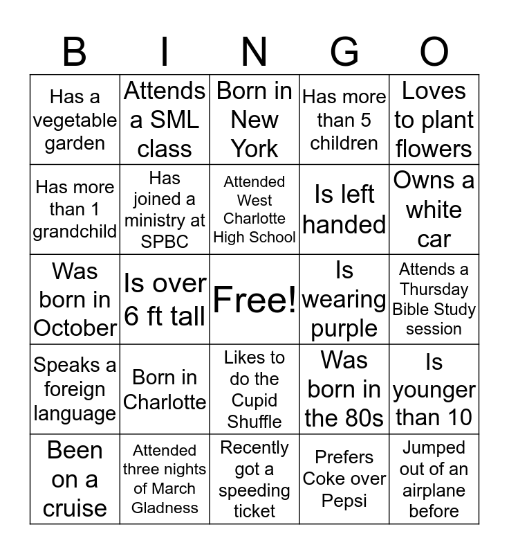 This bingo card has a free space and 24 words: Born in Charlotte, Attended three nights of March Gladness, Attended West Charlotte High School, Been on a cruise, Loves to plant flowers, Has a vegetable garden, Has more than 1 grandchild, Attends a SML class, Is wearing purple, Likes to do the Cupid Shuffle, Is left handed, Was born in October, Was born in the 80s, Is younger than 10, Has joined a ministry at SPBC, Prefers Coke over Pepsi, Attends a Thursday Bible Study session, Born in New York, Owns a white car, Is over 6 ft tall, Jumped out of an airplane before, Speaks a foreign language, Has more than 5 children and Recently got a speeding ticket.