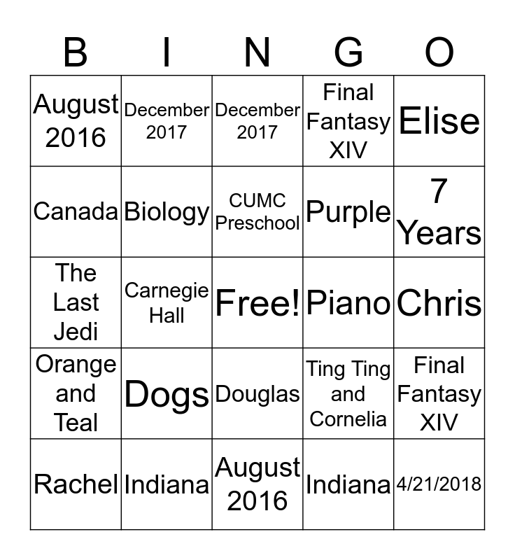 This bingo card has a free space and 24 words: Dogs, Indiana, CUMC Preschool, Rachel, Elise, August 2016, Canada, December 2017, Piano, Douglas, Purple, The Last Jedi, Ting Ting and Cornelia, Final Fantasy XIV, Biology, Indiana, Chris, December 2017, 7 Years, Carnegie Hall, 4/21/2018, Orange and Teal, Final Fantasy XIV and August 2016.