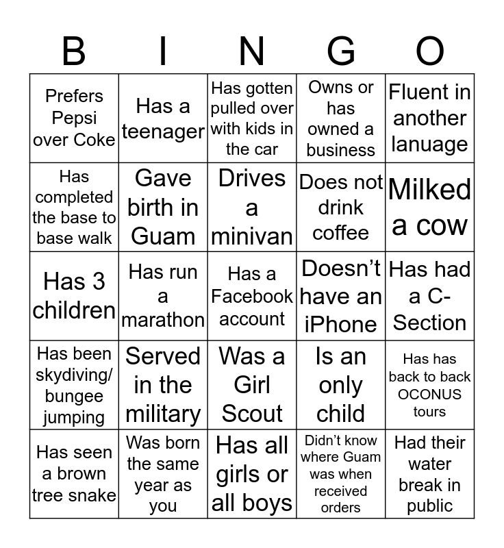 This bingo card has a free space and 24 words: Served in the military, Was born the same year as you, Drives a minivan, Has seen a brown tree snake, Fluent in another lanuage, Prefers Pepsi over Coke, Has completed the base to base walk, Has a teenager, Doesn’t have an iPhone, Was a Girl Scout, Does not drink coffee, Has 3 children, Is an only child, Has has back to back OCONUS tours, Gave birth in Guam, Didn’t know where Guam was when received orders, Has had a C-Section, Has gotten pulled over with kids in the car, Milked a cow, Has run a marathon, Had their water break in public, Has been skydiving/ bungee jumping, Owns or has owned a business and Has all girls or all boys.
