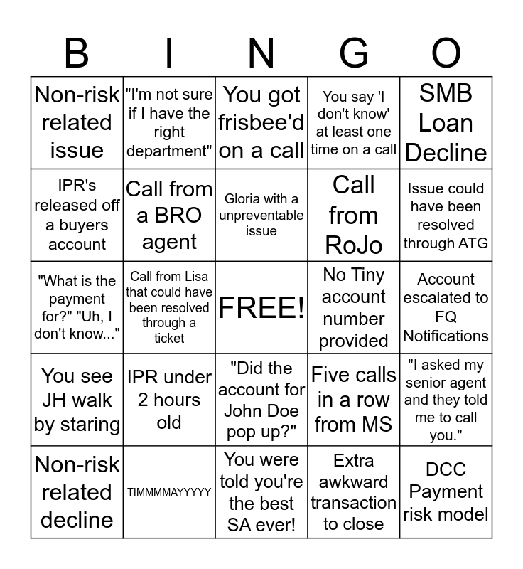 This bingo card has a free space and 24 words: IPR under 2 hours old, TIMMMMAYYYYY, Gloria with a unpreventable issue, Non-risk related decline, SMB Loan Decline, Non-risk related issue, IPR's released off a buyers account, "I'm not sure if I have the right department", No Tiny account number provided, "Did the account for John Doe pop up?", Call from RoJo, "What is the payment for?" "Uh, I don't know...", Five calls in a row from MS, "I asked my senior agent and they told me to call you.", Call from a BRO agent, Extra awkward transaction to close, Account escalated to FQ Notifications, You got frisbee'd on a call, Issue could have been resolved through ATG, Call from Lisa that could have been resolved through a ticket, DCC Payment risk model, You see JH walk by staring, You say 'I don't know' at least one time on a call and You were told you're the best SA ever!.