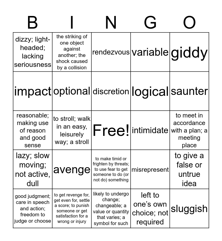 This bingo card has a free space and 24 words: avenge, to get revenge for, get even for, settle a score; to punish someone or get satisfaction for a wrong or injury, discretion, good judgment; care in speech and action; freedom to judge or choose, giddy, dizzy; light-headed; lacking seriousness, impact, the striking of one object against another; the shock caused by a collision, intimidate, to make timid or frighten by threats; to use fear to get someone to do (or not do) something, logical, reasonable; making use of reason and good sense, misrepresent, to give a false or untrue idea, optional, left to one’s own choice; not required, to meet in accordance with a plan; a meeting place, rendezvous, saunter, to stroll; walk in an easy, leisurely way; a stroll, sluggish, lazy; slow moving; not active, dull, variable and likely to undergo change; changeable; a value or quantity that varies; a symbol for such.