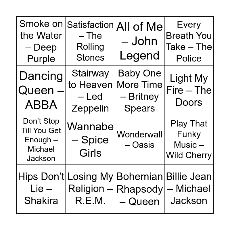 This bingo card has 64 words: The Twist – Chubby Checker, Hey Jude – The Beatles, Sugar, sugar – The Archies, I’m A Believer – The Monkees, It’s Now or Never – Elvis Presley, She Loves You – The Beatles, Satisfaction – The Rolling Stones, The House of the Rising Sun – The Animals, Light My Fire – The Doors, Stayin’ Alive – Bee Gees, Superstition – Stevie Wonder, I Will Survive – Gloria Gaynor, Bohemian Rhapsody – Queen, Dancing Queen – ABBA, Killing Me Softly – Roberta Flack, Stairway to Heaven – Led Zeppelin, Play That Funky Music – Wild Cherry, Smoke on the Water – Deep Purple, Tiny Dancer – Elton John, Don’t Stop Till You Get Enough – Michael Jackson, Take On Me – A-ha, Billie Jean – Michael Jackson, Every Breath You Take – The Police, Livin’ on a Prayer – Bon Jovi, Sweet Child O’ Mine – Guns N’ Roses, Don’t Stop Believin’ – Journey, Girls Just Want to Have Fun – Cyndi Lauper, I Wanna Dance with Somebody – Whitney Houston, Wake Me Up Before You Go-Go – Wham!, The Eye of the Tiger – Survivor, Africa – Toto, Like a Prayer – Madonna, Should I Stay or Should I Go – The Clash, I Will Always Love You – Whitney Houston, Wannabe – Spice Girls, You Can’t Touch This – MC Hammer, Bitter Sweet Symphony – The Verve, My Heart Will Go On – Celine Dion, Ice Ice Baby – Vanilla Ice, Baby One More Time – Britney Spears, Wonderwall – Oasis, Losing My Religion – R.E.M., Crazy in Love – Beyonce, Bleeding Love – Leona Lewis, You’re Beautiful – James Blunt, Hips Don’t Lie – Shakira, Seven Nation Army – The White Stripes, Where is the Love – Black Eyed Peas, Mr. Brightside – The Killers, Use Somebody – Kings of Leon, I’m Yours – Jason Mraz, Dilemma – Kelly Rowland ft. Nelly, Umbrella – Rihanna, Rolling in the Deep – Adele, Happy – Pharrell Williams, Just The Way You Are – Bruno Mars, All of Me – John Legend, Set Fire to the Rain – Adele, Call Me Maybe – Carly Rae Jepsen, Shake It Off – Taylor Swift, Can’t Feel My Face – The Weeknd, Can’t Stop the Feeling – Justin Timberlake, Shape of You – Ed Sheeran and Roar – Katy Perry.