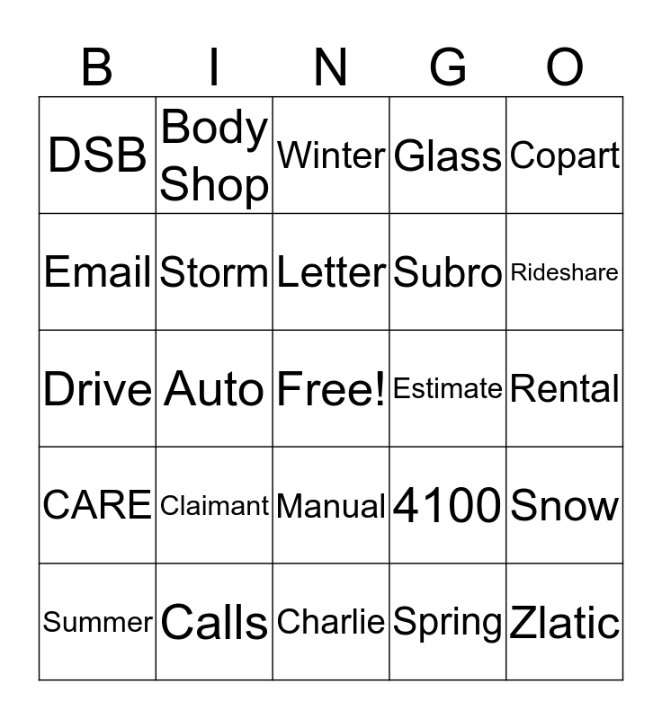 This bingo card has a free space and 62 words: EFNOL, Calls, Claim, CARE, Home, MyDirect, Storm, Liability, Subro, Safelite, Glass, Collision, Email, Rask, DIV, DSB, Zlatic, Copart, Coverage, Letter, Estimate, Winter, Summer, Spring, Fall, Deer, Assignment, Ice, Snow, Flood, Roof, Shingles, Carrier, Deductible, Rental, Body Shop, Vehicle, Policy, Auto, Key, Drive, Insured, Claimant, Tow, Rideshare, 4100, 6920, 5400, Unlisted, Tree, Manual, Charlie, Desk, Trexo, Forms, Injury, Supervisor, Police, Alert, AUX, Login and Report.