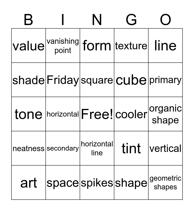 This bingo card has a free space and 24 words: secondary, space, square, art, line, value, shade, vanishing point, cooler, horizontal line, cube, tone, tint, vertical, Friday, shape, organic shape, form, primary, horizontal, geometric shapes, neatness, texture and spikes.