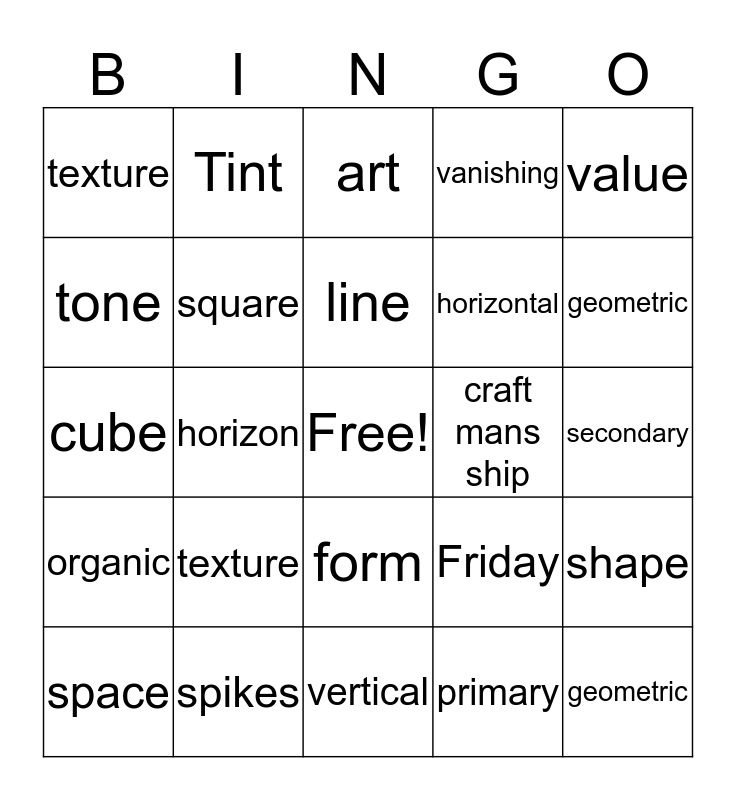 This bingo card has a free space and 24 words: texture, spikes, line, space, value, texture, tone, Tint, craft mans ship, form, horizontal, cube, Friday, shape, square, primary, secondary, art, geometric, horizon, geometric, organic, vanishing and vertical.