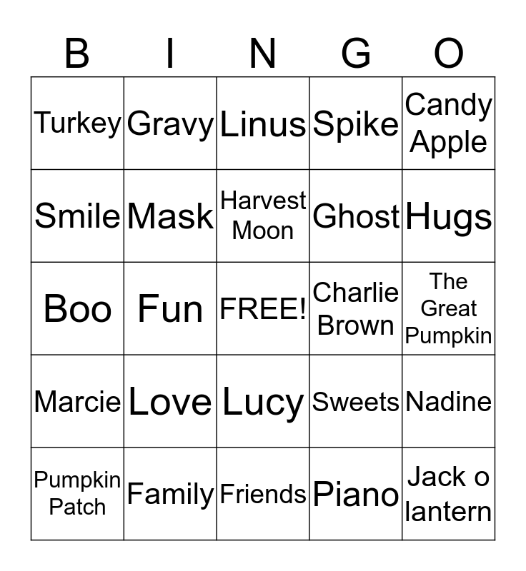 This bingo card has a free space and 24 words: Love, Family, Harvest Moon, Pumpkin Patch, Candy Apple, Turkey, Smile, Gravy, Charlie Brown, Lucy, Ghost, Boo, Sweets, Nadine, Mask, Piano, The Great Pumpkin, Linus, Hugs, Fun, Jack o lantern, Marcie, Spike and Friends.