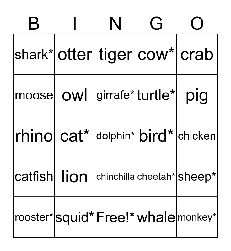 This bingo card has 25 words: catfish, squid*, dolphin*, whale, crab, shark*, otter, tiger, bird*, sheep*, moose, owl, Free!*, cheetah*, pig, rooster*, cat*, girrafe*, turtle*, chicken, rhino, lion, chinchilla, cow* and monkey*.