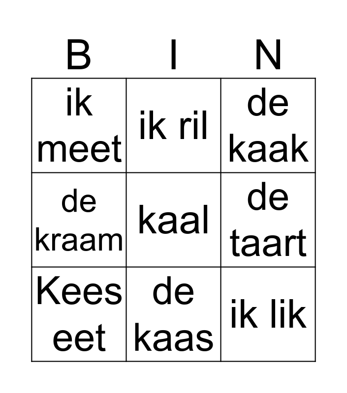 This bingo card has 26 words: Free!, ik vis, kaal, ik eet, Kees eet, ik ril, de taart, ik meet, de vis, de kaart, de meel, ik lees, ik vaar, het raam, de kist, ik lig, de kraam, Kees, de kaak, Kees meet, de kaas, de kip, het vlees, de vaas, ik lik and de keel.