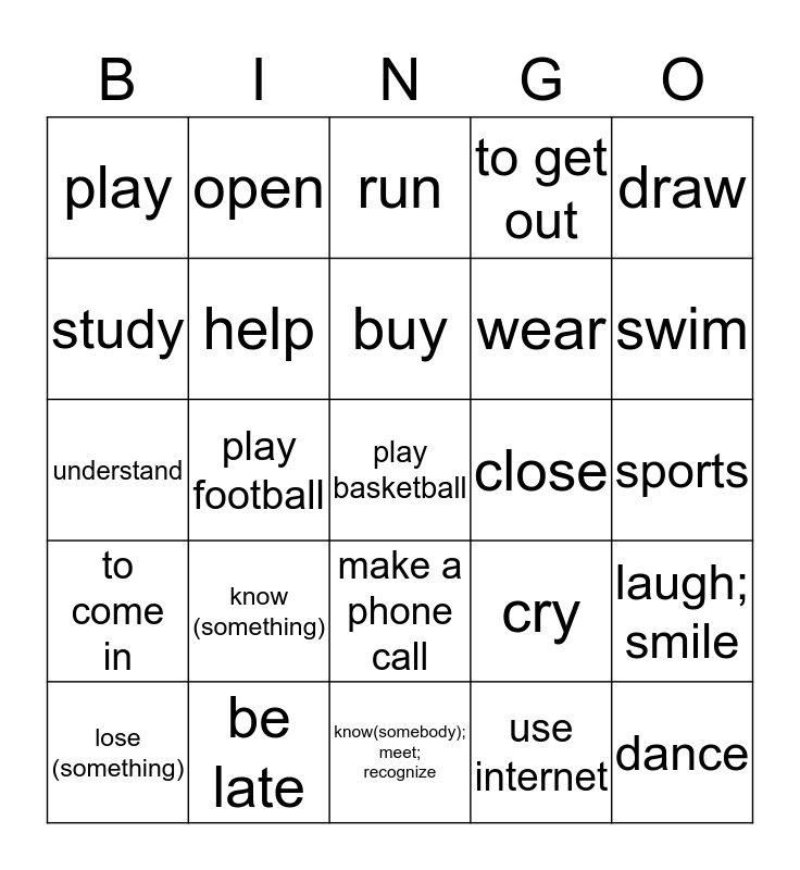 This bingo card has 25 words: know (something), know(somebody); meet; recognize, buy, lose (something), draw, play, study, open, close, make a phone call, wear, understand, cry, laugh; smile, help, dance, sports, run, swim, play football, play basketball, be late, to come in, to get out and use internet.