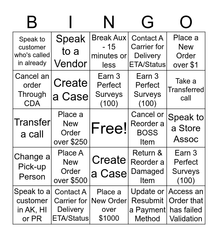 This bingo card has a free space and 24 words: Place A New Order over $500, Contact A Carrier for Delivery ETA/Status, Earn 3 Perfect Surveys (100), Speak to a customer in AK, HI or PR, Place a New Order over $1, Speak to customer who's called in already, Cancel an order Through CDA, Speak to a Vendor, Cancel or Reorder a BOSS Item, Create a Case, Earn 3 Perfect Surveys (100), Transfer a call, Return & Reorder a Damaged Item, Earn 3 Perfect Surveys (100), Create a Case, Update or Resubmit a Payment Method, Speak to a Store Assoc, Break Aux - 15 minutes or less, Take a Transferred call, Place a New Order over $250, Access an Order that has failed Validation, Change a Pick-up Person, Contact A Carrier for Delivery ETA/Status and Place a New Order over $1000.