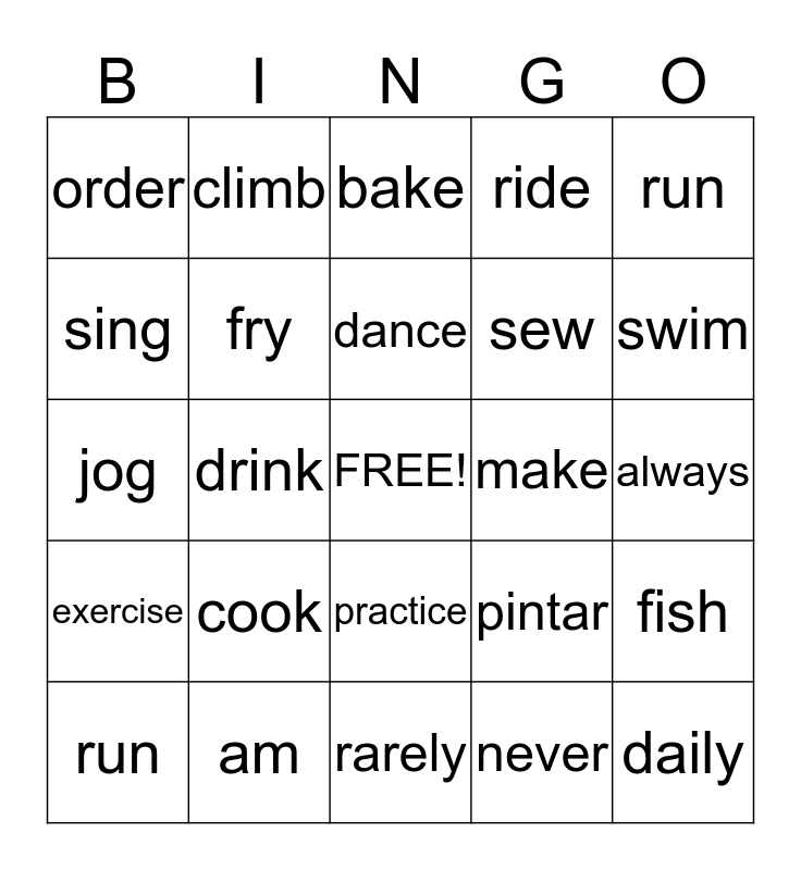 This bingo card has a free space and 29 words: run, chew, drink, eat, order, bake, fry, cook, make, am, always, daily, rarely, never, swim, play, practice, exercise, run, jog, pintar, bake, sew, sing, ride, climb, fish, dance and walk.