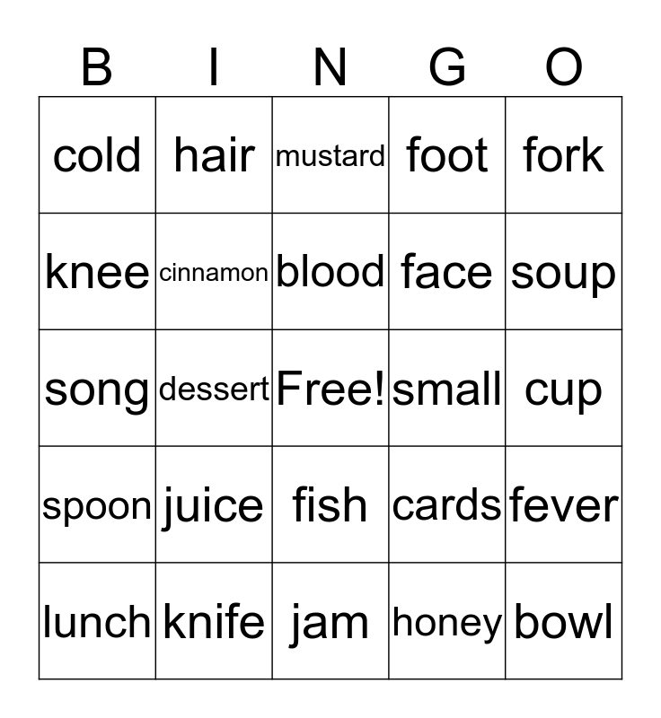 This bingo card has a free space and 29 words: lunch, dinner, dessert, ice, cold, mustard, cinnamon, juice, small, knife, cup, bowl, jam, honey, soup, onions, fish, spoon, fork, song, cards, head, face, knee, foot, hair, fever, blood and cough.