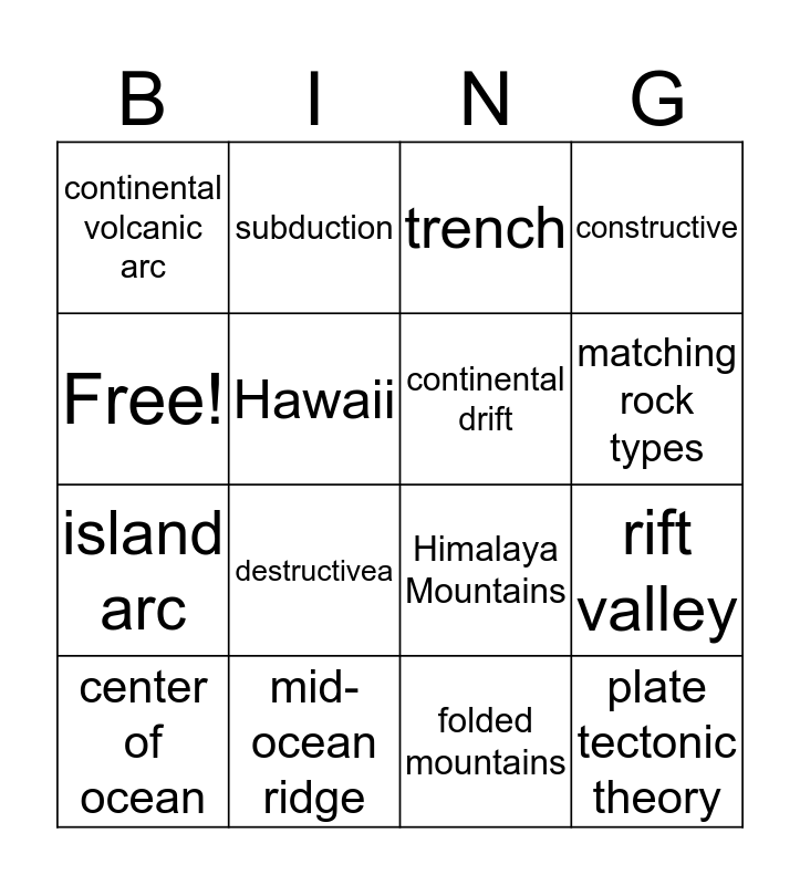 This bingo card has 16 words: mid-ocean ridge, rift valley, trench, continental volcanic arc, island arc, subduction, Himalaya Mountains, folded mountains, Free!, Hawaii, center of ocean, constructive, destructivea, matching rock types, continental drift and plate tectonic theory.