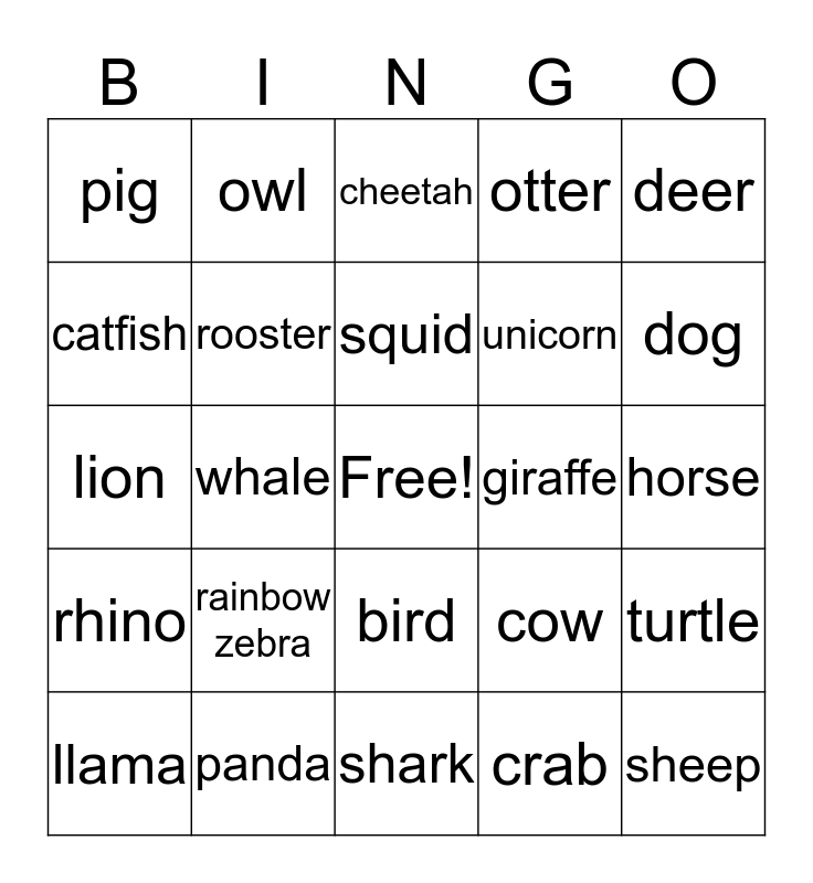 This bingo card has a free space and 24 words: rainbow zebra, panda, squid, llama, deer, pig, catfish, owl, giraffe, bird, unicorn, lion, cow, turtle, rooster, crab, horse, cheetah, dog, whale, sheep, rhino, otter and shark.