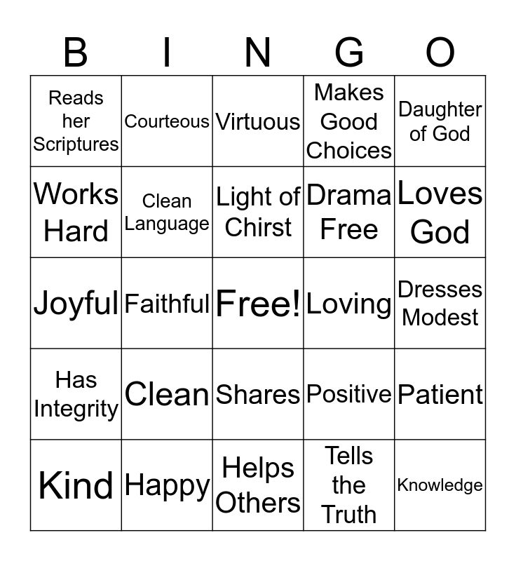 This bingo card has a free space and 24 words: Clean, Happy, Light of Chirst, Kind, Daughter of God, Reads her Scriptures, Works Hard, Courteous, Loving, Shares, Drama Free, Joyful, Positive, Patient, Clean Language, Tells the Truth, Dresses Modest, Virtuous, Loves God, Faithful, Knowledge, Has Integrity, Makes Good Choices and Helps Others.