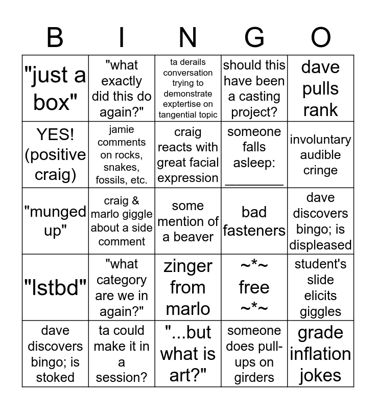 This bingo card has 25 words: "what category are we in again?", "...but what is art?", craig reacts with great facial expression, dave discovers bingo; is stoked, dave pulls rank, "just a box", YES! (positive craig), "what exactly did this do again?", bad fasteners, zinger from marlo, someone falls asleep: ________, "munged up", ~*~ free ~*~, student's slide elicits giggles, jamie comments on rocks, snakes, fossils, etc., grade inflation jokes, dave discovers bingo; is displeased, ta derails conversation trying to demonstrate exptertise on tangential topic, involuntary audible cringe, craig & marlo giggle about a side comment, some mention of a beaver, ta could make it in a session?, "lstbd", should this have been a casting project? and someone does pull-ups on girders.