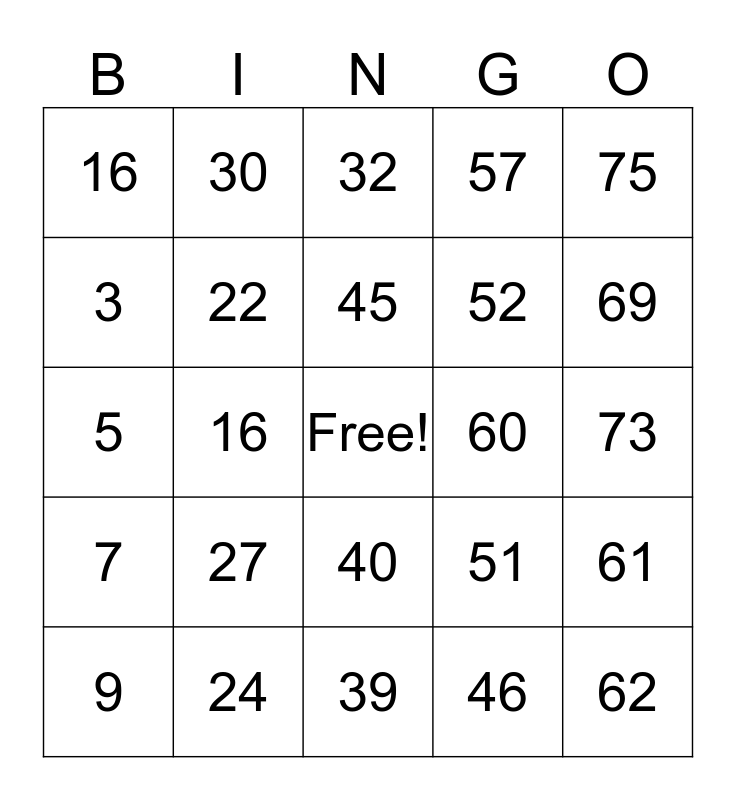 This bingo card has a free space and 24 words: 9, 27, 45, 46, 75, 16, 30, 32, 60, 73, 5, 22, 51, 61, 3, 24, 39, 57, 69, 7, 16, 40, 52 and 62.
