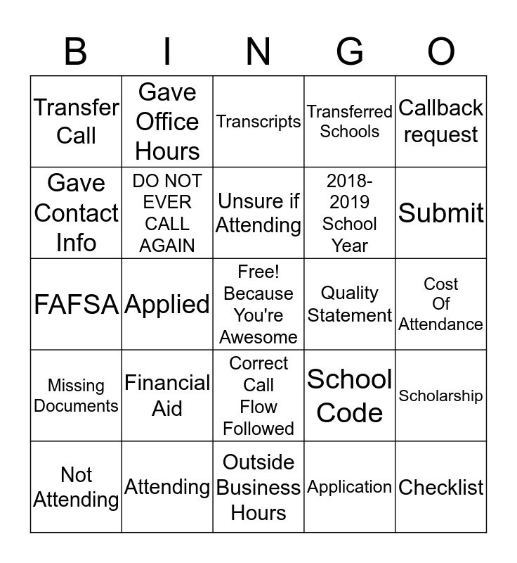 This bingo card has a free space and 24 words: Financial Aid, Attending, Unsure if Attending, Not Attending, Callback request, Transfer Call, Gave Contact Info, Gave Office Hours, Quality Statement, Correct Call Flow Followed, 2018-2019 School Year, FAFSA, School Code, Scholarship, DO NOT EVER CALL AGAIN, Application, Cost Of Attendance, Transcripts, Submit, Applied, Checklist, Missing Documents, Transferred Schools and Outside Business Hours.