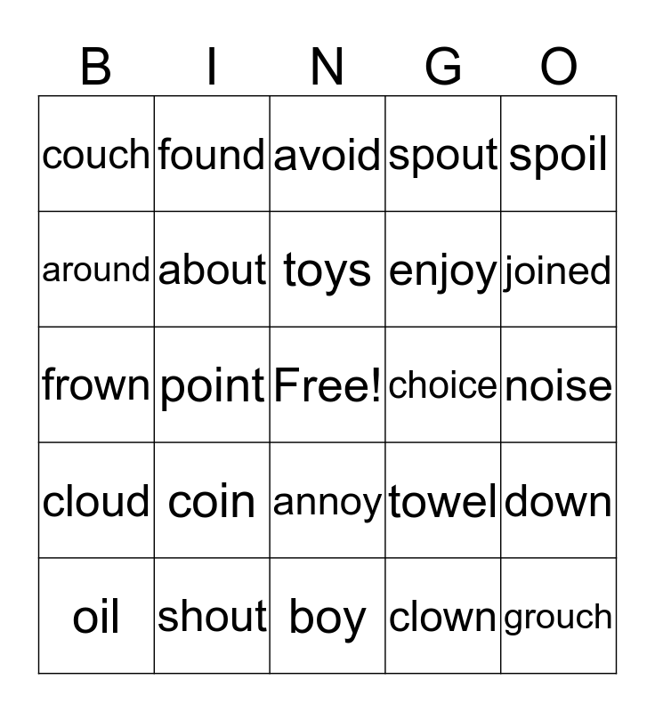 This bingo card has a free space and 25 words: coin, boy, toys, oil, spoil, couch, around, found, choice, annoy, enjoy, frown, towel, down, about, loyal, noise, avoid, joined, point, grouch, shout, cloud, spout and clown.