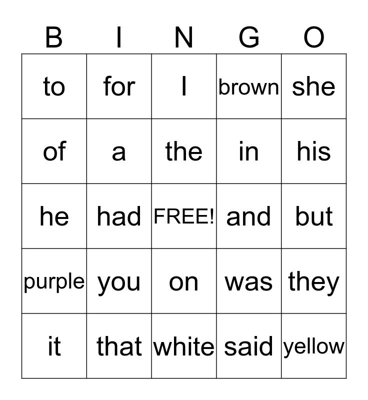 This bingo card has a free space and 24 words: you, that, the, it, she, to, of, for, and, on, in, he, was, they, a, said, but, I, his, had, yellow, purple, brown and white.