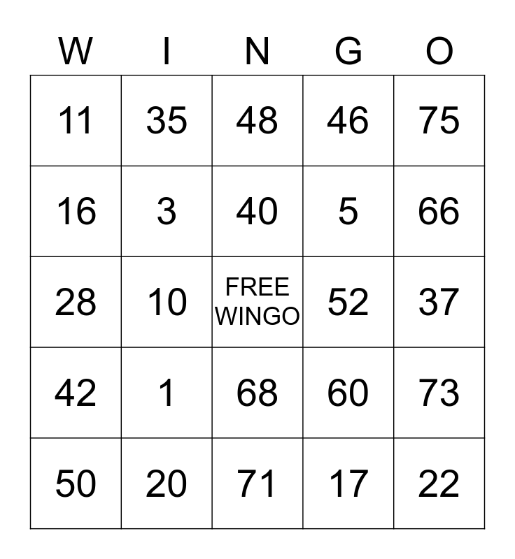 This bingo card has a free space and 24 words: 1, 20, 40, 50, 75, 11, 16, 35, 52, 68, 5, 28, 60, 73, 3, 17, 37, 48, 66, 10, 22, 42, 46 and 71.