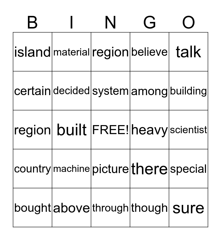 This bingo card has a free space and 24 words: machine, above, system, bought, talk, island, certain, material, heavy, picture, among, region, there, special, decided, though, scientist, region, building, built, sure, country, believe and through.