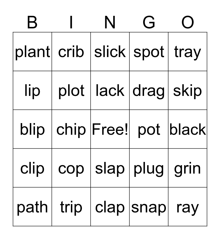 This bingo card has a free space and 24 words: cop, trip, lack, path, tray, plant, lip, crib, pot, slap, drag, blip, plug, grin, plot, snap, black, slick, skip, chip, ray, clip, spot and clap.