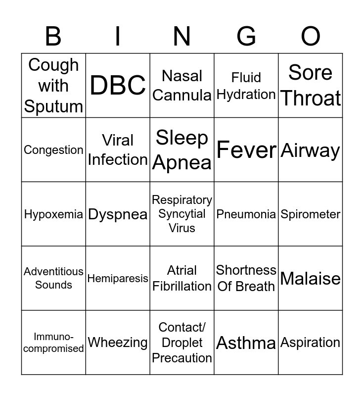 This bingo card has 25 words: Adventitious Sounds, Wheezing, Respiratory Syncytial Virus, Asthma, Sore Throat, Cough with Sputum, DBC, Nasal Cannula, Pneumonia, Malaise, Congestion, Viral Infection, Contact/ Droplet Precaution, Shortness Of Breath, Airway, Immuno- compromised, Dyspnea, Sleep Apnea, Fever, Spirometer, Hypoxemia, Hemiparesis, Atrial Fibrillation, Fluid Hydration and Aspiration.