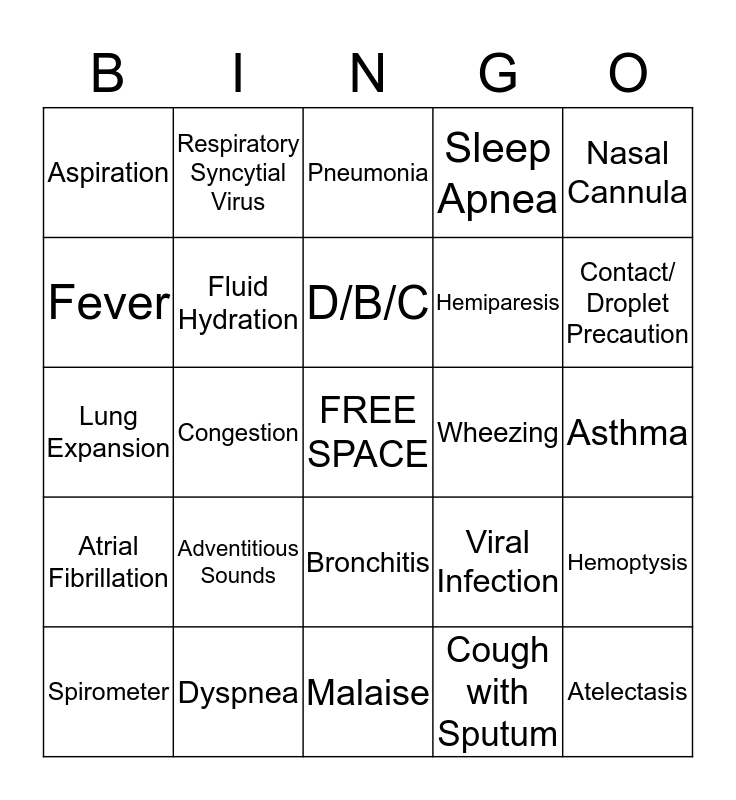 This bingo card has a free space and 24 words: Spirometer, Adventitious Sounds, D/B/C, Cough with Sputum, Nasal Cannula, Aspiration, Respiratory Syncytial Virus, Pneumonia, Wheezing, Asthma, Lung Expansion, Fluid Hydration, Viral Infection, Hemoptysis, Fever, Dyspnea, Malaise, Sleep Apnea, Contact/ Droplet Precaution, Atrial Fibrillation, Congestion, Bronchitis, Hemiparesis and Atelectasis.
