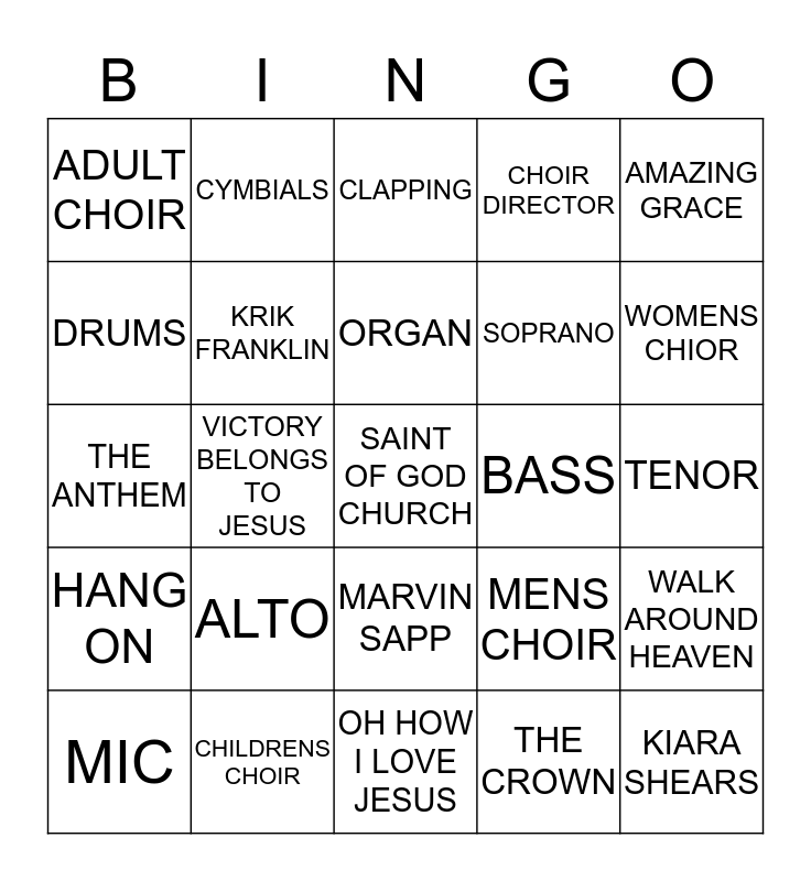 This bingo card has a free space and 24 words: ALTO, CHILDRENS CHOIR, ORGAN, MIC, AMAZING GRACE, ADULT CHOIR, DRUMS, CYMBIALS, BASS, MARVIN SAPP, SOPRANO, THE ANTHEM, MENS CHOIR, WALK AROUND HEAVEN, KRIK FRANKLIN, THE CROWN, TENOR, CLAPPING, WOMENS CHIOR, VICTORY BELONGS TO JESUS, KIARA SHEARS, HANG ON, CHOIR DIRECTOR and OH HOW I LOVE JESUS.